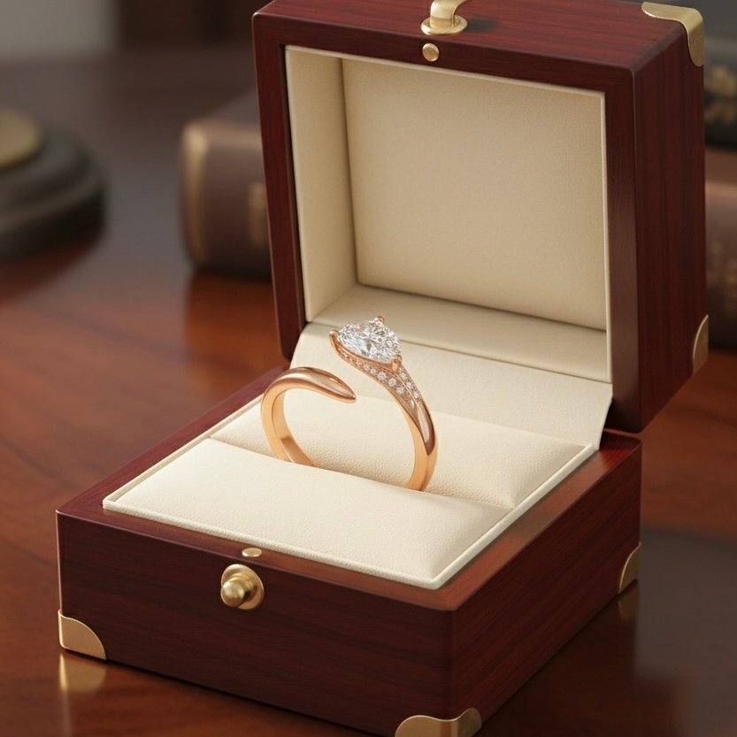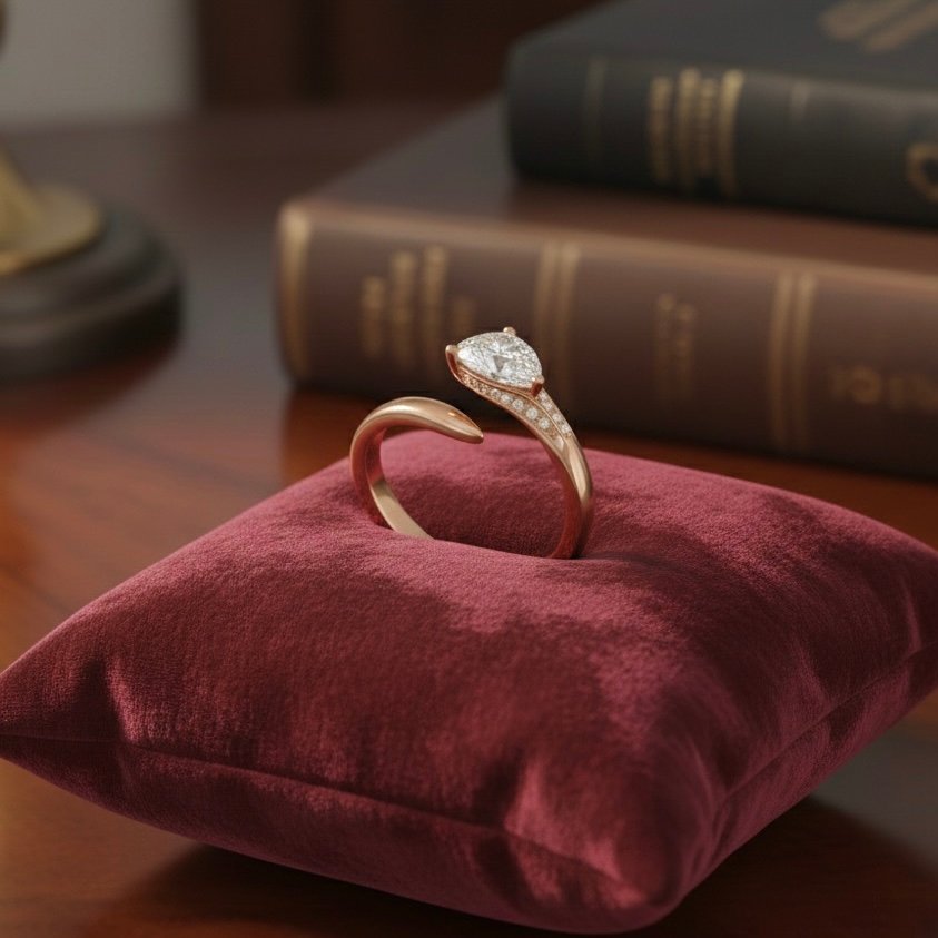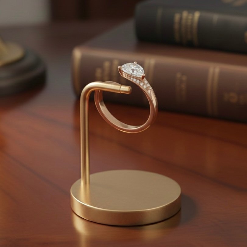A flowing open-band silhouette meets a radiant pear-cut center stone, creating a design that feels like light in motion. Set in warm rose gold, the ring curves gracefully around the finger, accented with a delicate trail of pavé stones that add soft brilliance. Elegant, modern, and beautifully fluid—crafted for those who love effortless luxury.