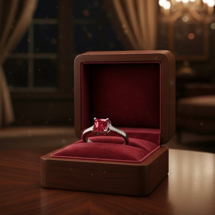 A bold square-cut ruby commands the center of this masterpiece, radiating royal crimson fire. Set in polished silver, the stone is framed by a sleek cathedral rise and a refined pavé line of sparkling moissanites along the shoulders. The clean architecture and sharp geometry give the piece a modern regal energy—powerful, elegant, and unmistakably HB.